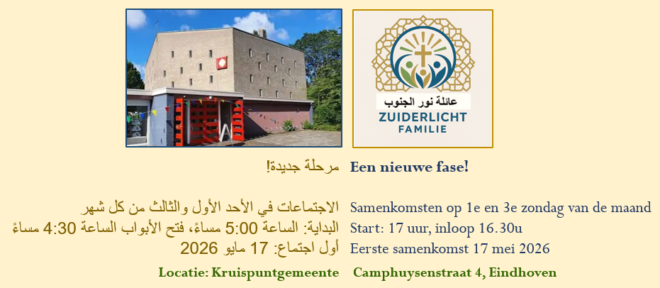 ZuiderLichtFamilie is een groep van christenen met zowel een Arabisch- als Nederlandstalige achtergrond die regelmatig samenkomt in de Kruispuntgemeente in Eindhoven. Ons verlangen is om met elkaar te groeien in geloof in Christus en dit geloof te delen met anderen. We richten ons met name op mensen met een Arabisch-talige achtergrond die in onze regio verblijven of wonen. Daarbij is iedereen welkom, of je nu wel of niet gelovig bent, moslim of andersgelovig, en in welke persoonlijk situatie je ook zit.